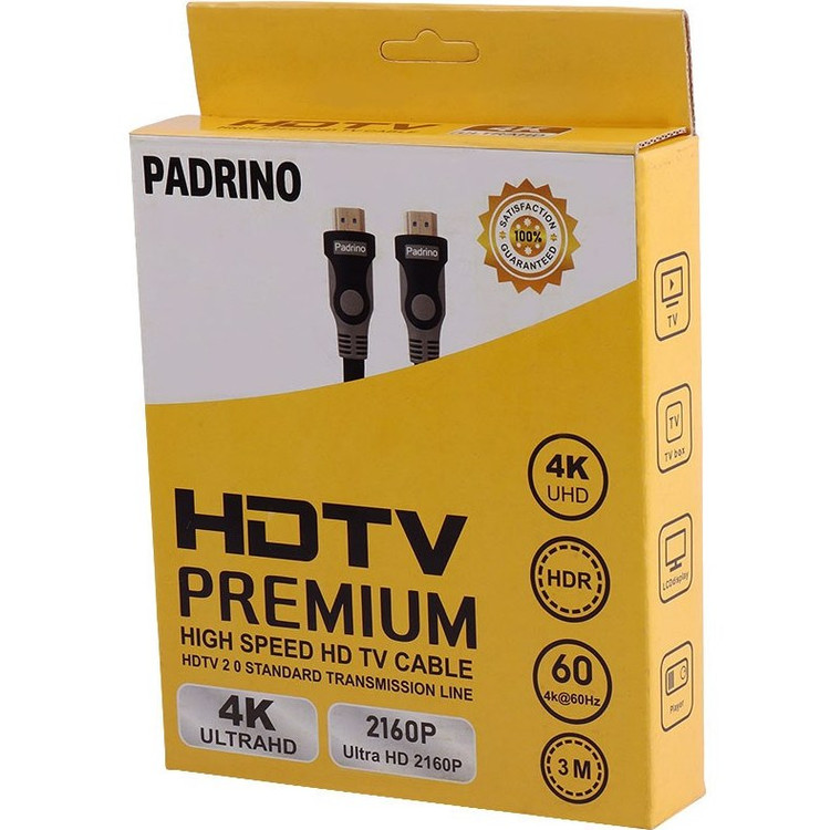 کابل اچ دی ام ای پادرینو با طول 3 متر پشتیبانی از رزولوشن 4K، اتصال سریع و راحت Plug and Play، دارای استاندارد سلامت و ایمنی محصول شامل FCC / RoHS / CE کانکتورها از نوع HDMI 2.0 مناسب جهت انتقال صدا و تصویر از دستگاه های مختلف مانند تلویزیون، لپ تاپ و ... به یکدیگر طول کابل برابر با 300 سانتی متر با روکشی از جنس پلاستیک، مقاوم در برابر کشش، خمیدگی و پارگی