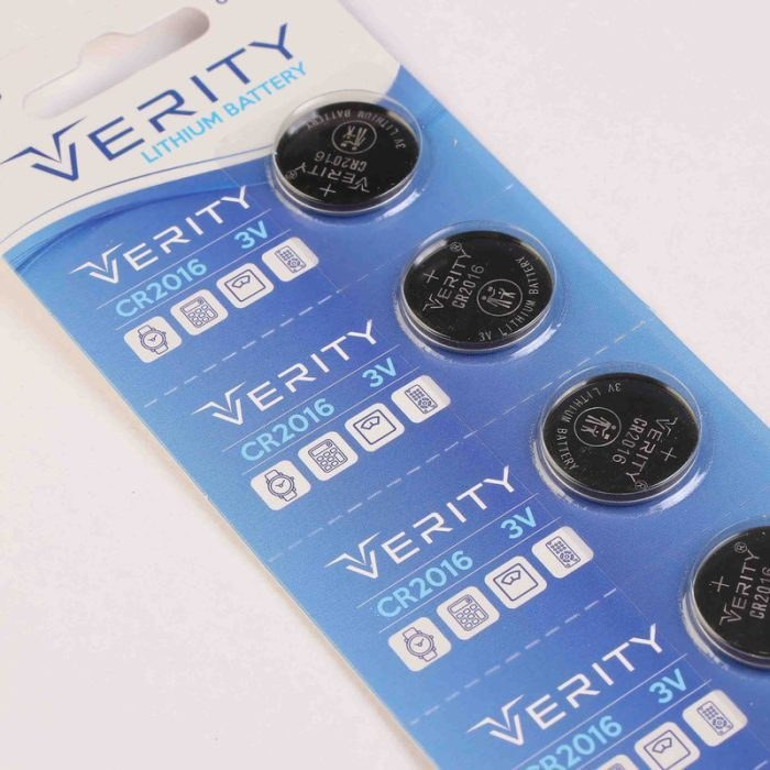 باتری سکه ای Verity مدل CR2016 در بسته ۵ عددی فاقد جیوه و کادمیوم، باتری لیتیومی با ولتاژ ۳ ولت در بسته بندی ۵ عددی مناسب برای استفاده در ماشین حساب، اسباب بازی های کوچک، دزدگیر ماشین و …