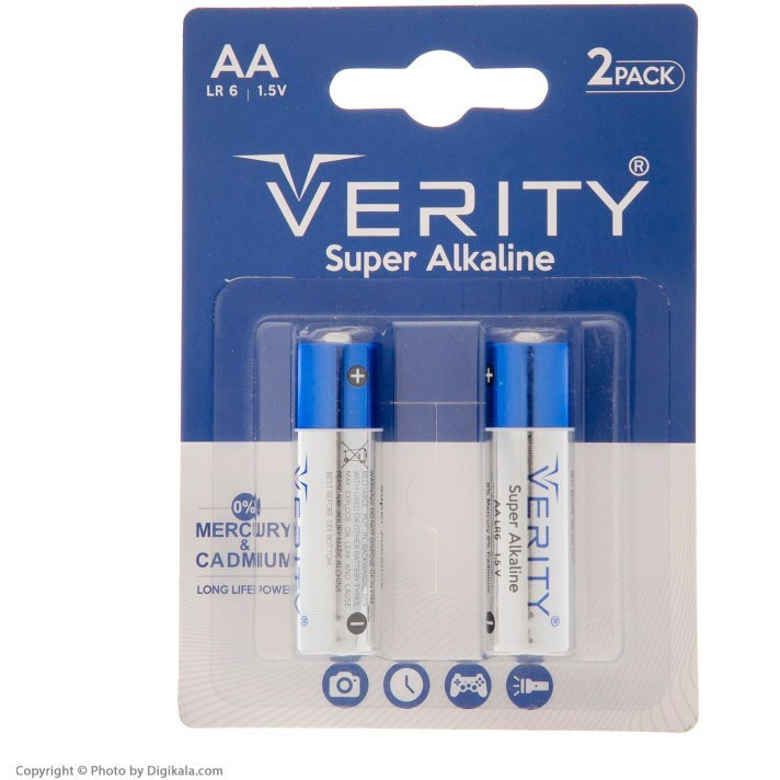 این مدل از محصولات «وریتی» (Verity) با استفاده از تکنولوژی آلکالاین ساخته شدهاند. باتریهای آلکالاین عمر بیشتری نسبت به باتریهای زینک کربن دارند؛ چراکه این نوع از باتریها با گذشت زمان انرژی خود را از دست نمیدهد و پایداری خوبی دارند. منظور از ماندگاری طولانی، توانایی حفظ و ذخیرهی انرژی باتریها تا چند سال است؛ البته این انرژی در صورتی ماندگار است و ذخیره میشود که از باتریها استفاده نکنید و آنها را درون کمد یا قفسه نگه دارید. در بستهبندی این مدل 2 عدد باتری قلمی وجود دارد و هر یک از باتریهای موجود در بستهبندی این مدل 1.5 ولتی است. باتریهای قلمی که با نام AA شناخته میشوند منبع انرژی قابلاطمینانی برای دستگاههای الکترونیکی مانند ریموت کنترل، اسباببازی، چراغ قوه و دیگر دستگاههایی از این قبیل محسوب میشوند. البته باید توجه داشته باشید که مدل «Alkaline» از سری باتریهای وریتی قابلیت شارژ مجدد ندارند و پس از اتمام انرژیشان باید باتریهای جدیدی تهیه کنید.
