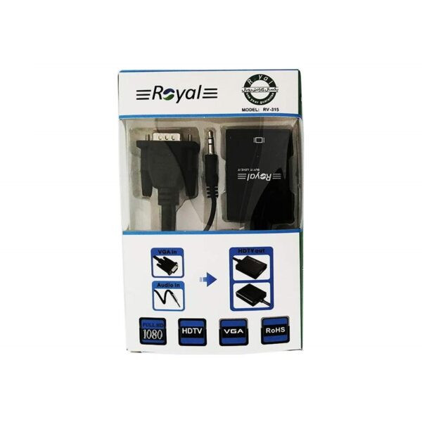 نوع کانکتور HDMI نوع درگاه VGA سازگار با انواع دستگاه های دارای پورت VGA پشتیبانی از رزولوشن ۱۲۰۰ × ۱۹۲۰ همراه با کابل صدای متصل به مبدل وزن90 گرم برند رویال