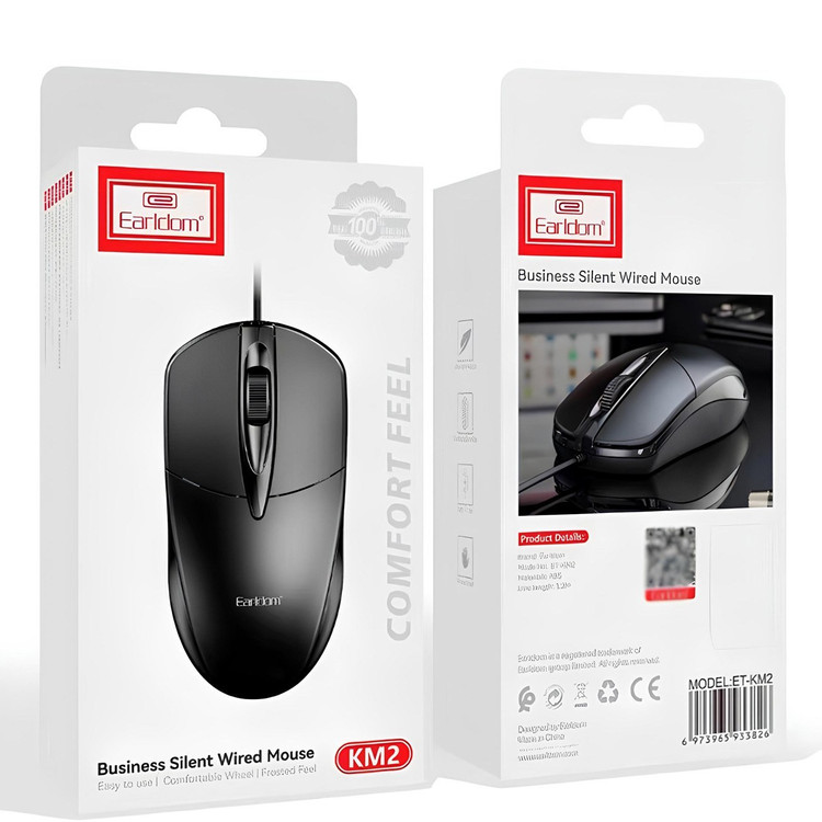 موس با سیم ارلدام مدل ET-KM2 اتصال با سیم از طریق رابط USB با کابل 120 سانتی متری و روکشی از جنس پلاستیک مقاوم در برابر کشش و پارگی متریال ساخت بدنه از پلاستیک ABS مقاوم در برابر ضربه و فشار احتمالی، دارای قابلیت کارکردن با هر دو دست طراحی شده به صورت ارگونومیک مناسب جهت استفاده طولانی مدت، پشتیبانی از اتصال Plug and Play بهره مندی از حسگر اپتیکال، مجهز به 3 کلید فیزیکی شامل کلید چپ/راست و اسکرول موفق به کسب استاندارد سلامت و ایمنی محصول شامل CE / FCC